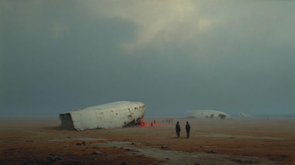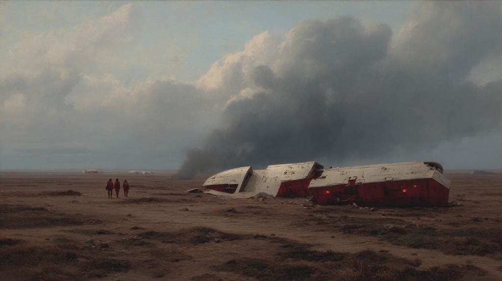 across a barren, windswept plain. There are roughly 30 survivors from a crew of 120.